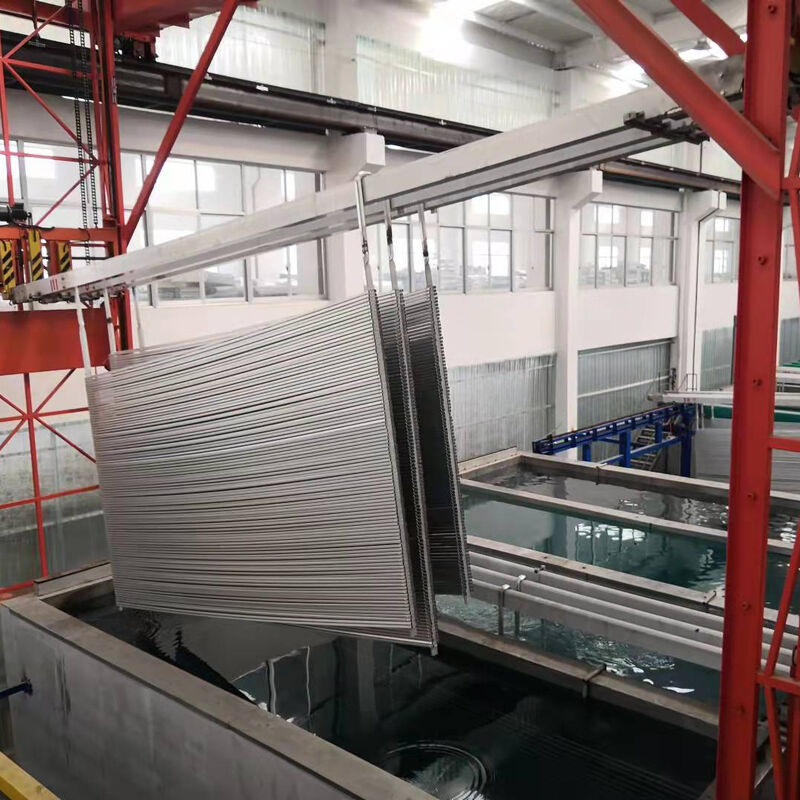 Máquina de anodizado para línea de producción de perfiles de aluminio Contenido: 1 tanque de desengrase, 1 tanque de ataque alcalino, 1 tanque de neutralización, 4 tanques de oxidación anódica, 2 tanques de flujo de anodizado, 3 tanques de coloración eléctrica, 1 tanque de sellado a temperatura media, 12 tanques de enjuague, 1 tanque de enjuague con agua caliente.